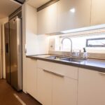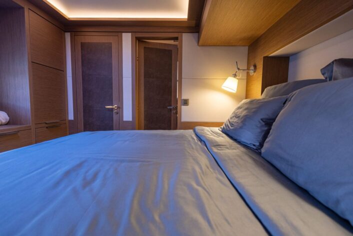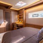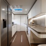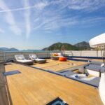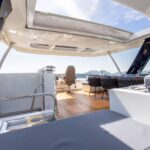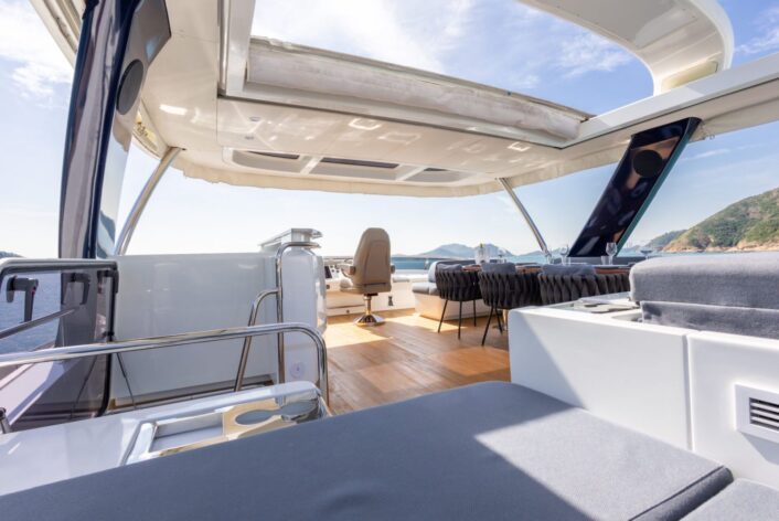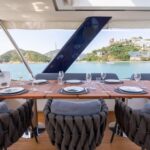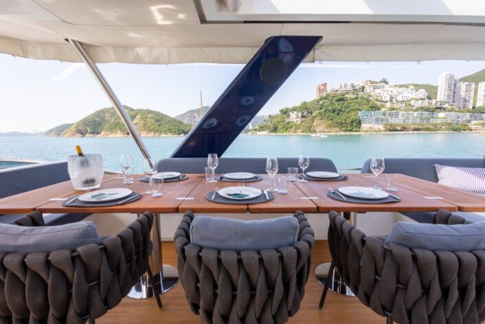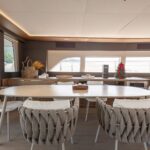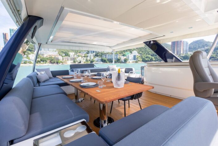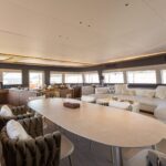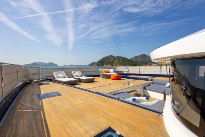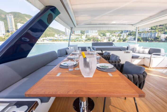 The open layout offers a breathtaking view of the surroundings, and the adjoining living space blends the interior with the exterior, resulting in the ambiance of a peaceful haven on the ocean with touches of natural lighting and sea breeze throughout the lounge areas. The flybridge is designed to encourage social interactions, with a dining table and lounge area on each side, perfect for cocktail or alfresco dining. The versatility of layout offered by the spaciousness is ideal for any kind of event. The connectivity of each area provides opportunities for a stable flow of guests between different zones that keeps your event lively and fun.